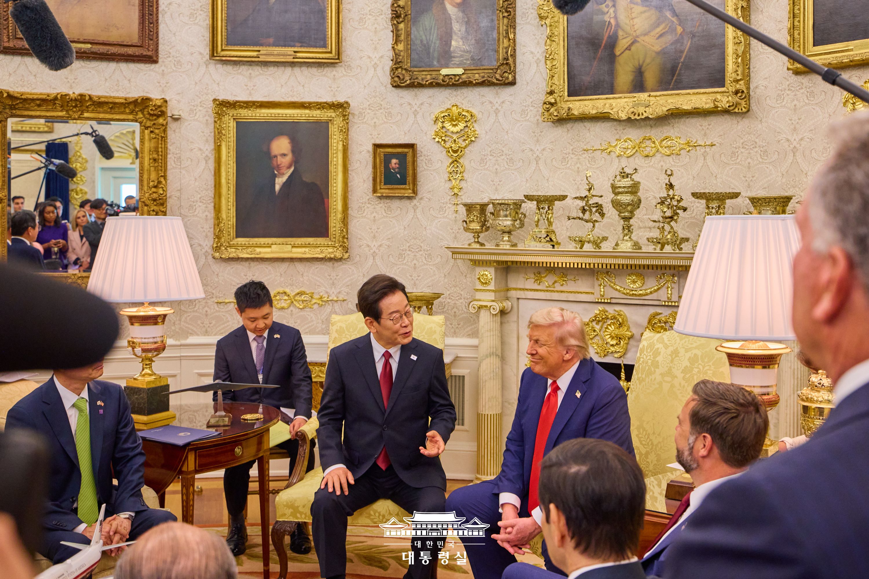 또한 모든 참석자들을 기프트 룸으로 안내해 마음에 드는 모자와 골프공, 골프 핀, 와이셔츠, 커프스 핀 등 고르도록 하고, 한번 더 사인을 해 주었습니다. 사인을 해 주기 위해 집무실 책상에 앉은 트럼프는 자신의 기념주화를 꺼내 참모들에게 또 한번 선물했습니다. 그러면서 "김정은을 만나라고 한 지도자는 처음이다. 이재명 대통령은 정말 스마트한 사람이다. 똑똑한 사람이다"라고 여러 번 말했습니다.